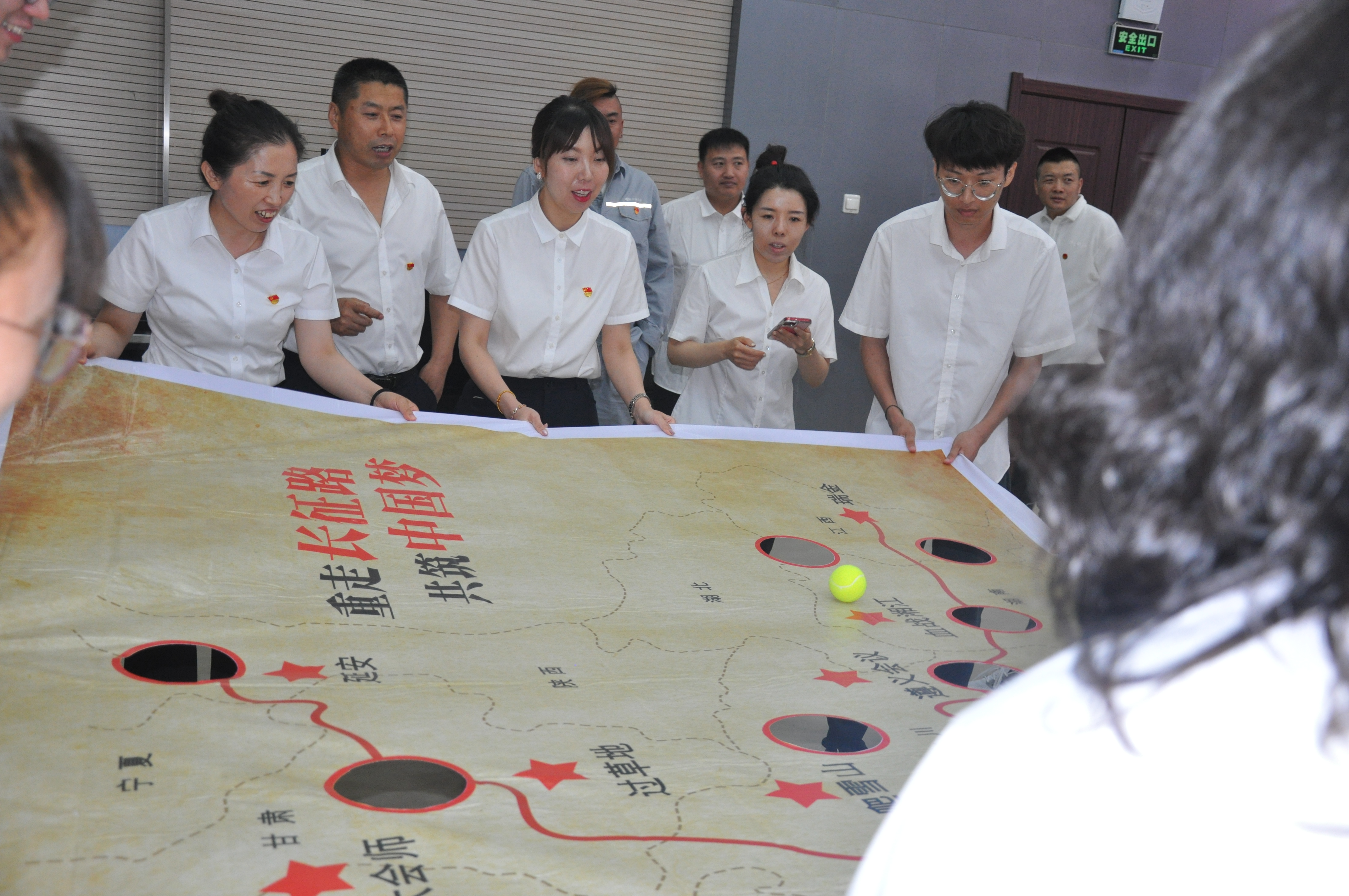 團隊協作與知識競答環節亮點頻出,成為系列活動的精彩篇章。“重走長征路”過程中,黨員們分組操控、緊密配合,及時調整策略,以協作與汗水詮釋長征精神;“手拉手穿紅衣”時,隊員們手挽手組成堅固鏈條,在歡聲笑語與相互鼓勵中,完成挑戰,凝聚起團結奮進的力量。極具創意的趣味知識競答主題黨日環節,“黨建熱詞看圖猜詞”“聽紅歌猜歌名”等競賽,將“兩個確立”“三會一課” 等理論知識轉化為趣味謎題,黨員們化身“解謎達人”“歌唱能手”,在頭腦風暴中深化理論理解,用《歌唱祖國》《我和我的祖國》《沒有共產黨就沒有新中國》的大合唱傳遞對黨和國家的深情告白并將活動推向高潮。?
